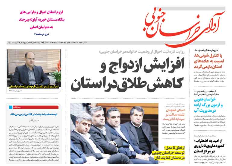 سرپرست ادارهکل ثبت احوال خراسان جنوبی با ارائه روایتی تازه از وضعیت خانواده در استان، از افزایش آمار ازدواج و کاهش طلاق خبر داد و گفت: در هشتماهه نخست امسال سههزار و ۷۰۶ فقره ازدواج به ثبت رسیده که نسبت به مدت مشابه سال گذشته رشد داشته و همزمان آمار طلاق نیز با ثبت ۹۴۵ واقعه کاهش یافته است. …. مشروح این خبر را در صفحه 5 روزنامه بخوانید